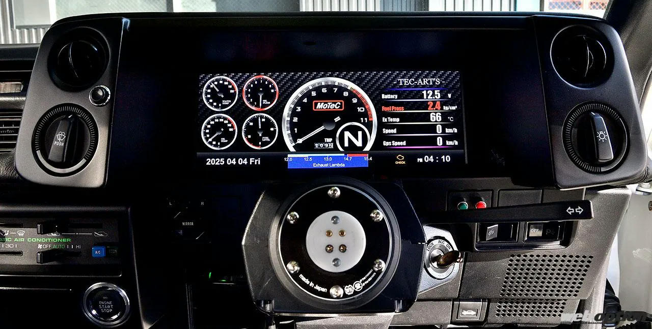 コクピットのメイキングも抜かりない。純正のアナログ/デジタルメーターはすべて撤去し、ビルトインされたのは12インチのカラー液晶「C1212」。任意の位置に情報を表示できる自由度に加え、専用ソフトを使えばオリジナルデザインのメーター画面も構築可能。本格的なロガー機能も搭載できるこのモデル、実は世界で初めてC1212を搭載したAE86として記録されている。