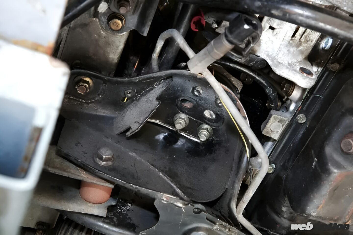 たしかに発想は理解できるが、それを実際に載せてしっかりと動くようにするには相当な苦労があったはず。その点について突っ込んでみたところ「エンジン側のブラケットはワンオフで作ったけど、ボディ側はノータッチ。ちょっとした加工でいけたとです! 苦労した点…、エキマニのスペースが厳しかったくらいやね」と、こともなげに語る。