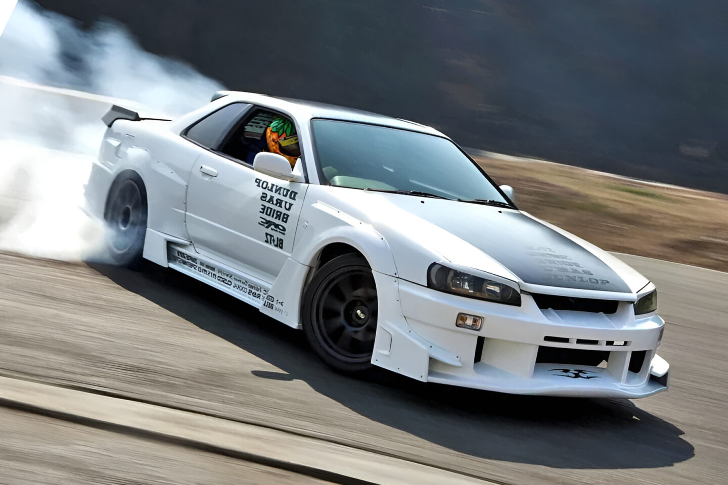 ファン!ファン! 快晴の空のもと、RB系とは明らかに異なるサウンドを奏でながら登場した“ユーラス”のR34スカイライン。ボンネットを開けてビックリ! 何とそこに収まっていたのはバブルが生んだ高級車、インフィニティQ45用のV8ユニット“VH45DE”ではないか…!!