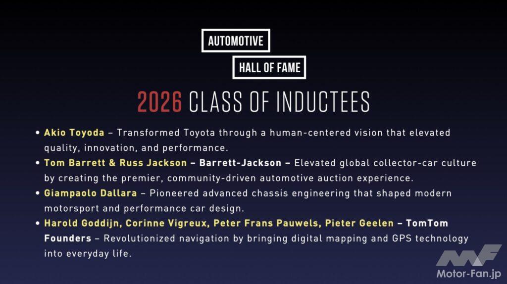 アメリカ自動車殿堂(The Automotive Hall of Fame)は、2026年の自動車殿堂入りの人々を発表した。そのひとりにトヨタ自動車の豊田章男会長が選ばれた。