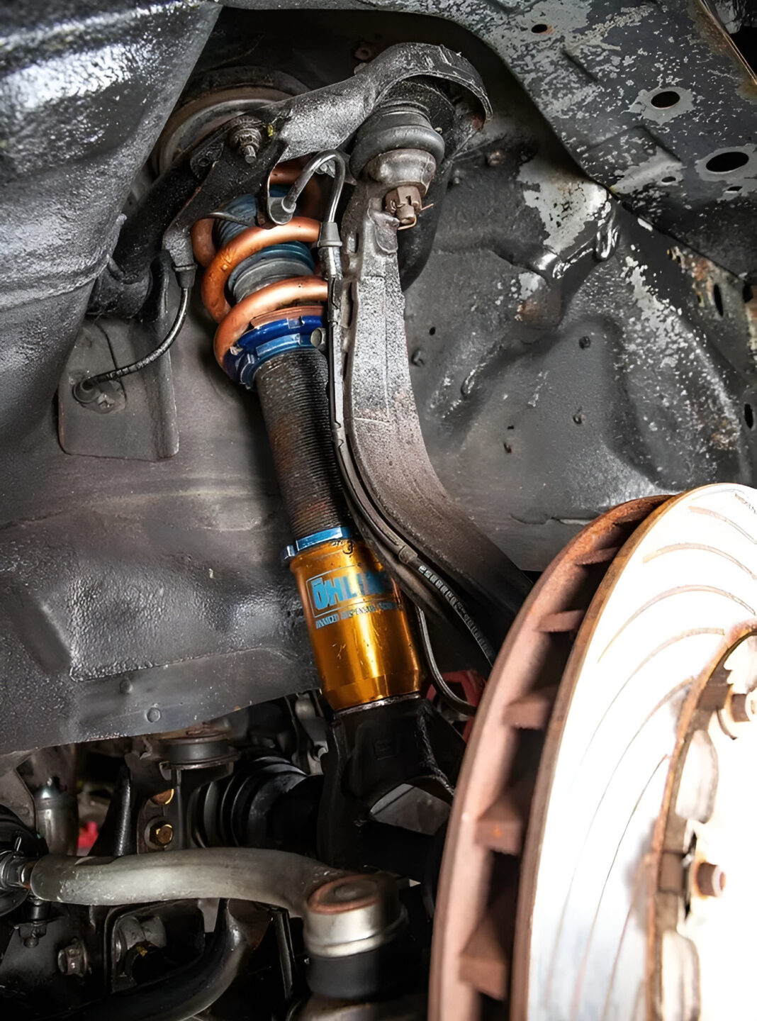 足回りはオーリンズベースのM&Mオリジナル車高調。スプリングレートはフロント26kg/mm、リヤ22kg/mmだ。フロントロワアームはワンオフで製作されたレーシングスペックが与えられている。