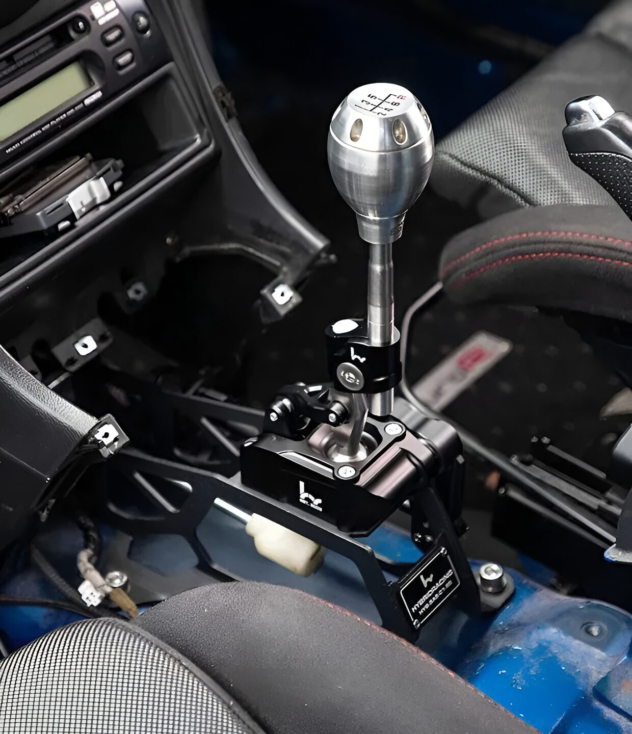 ミッションは純正だが、ギヤをDC5用(1~6速)に変更することでギヤ比を最適化。メカニカルなシフトレバーは、アメリカのハイブリッドレーシング製ショートシフター。削り出しで剛性感が高い上、レバーのポジションやストローク量も好みで調整することができる優れものだ。
