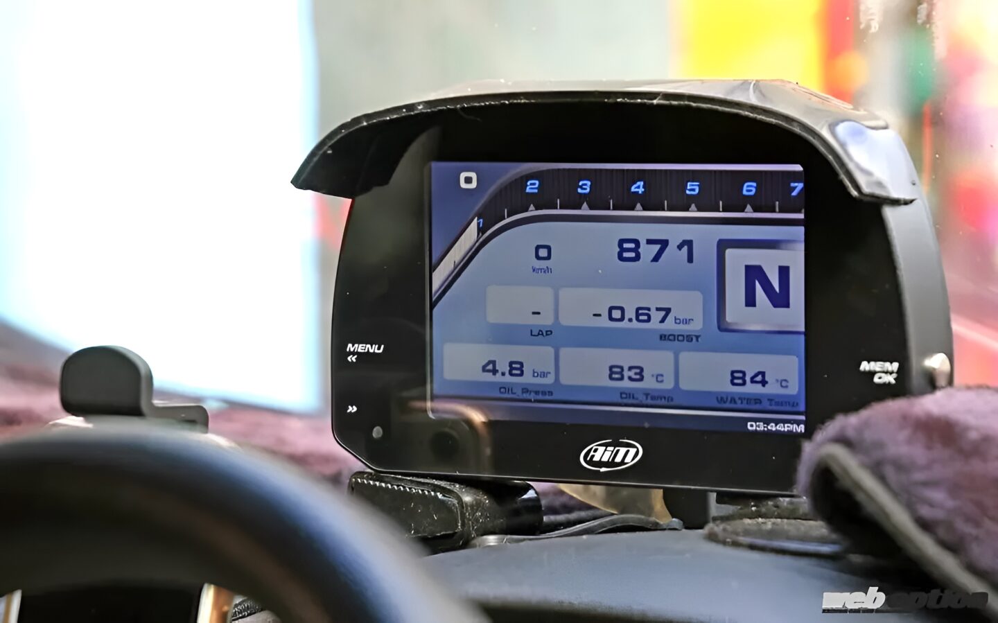 エンジンはLINKのフルコンで制御されているが、それと同期したaim製のダッシュロガーメーターが、このモンスターのキャラクターを物語る。