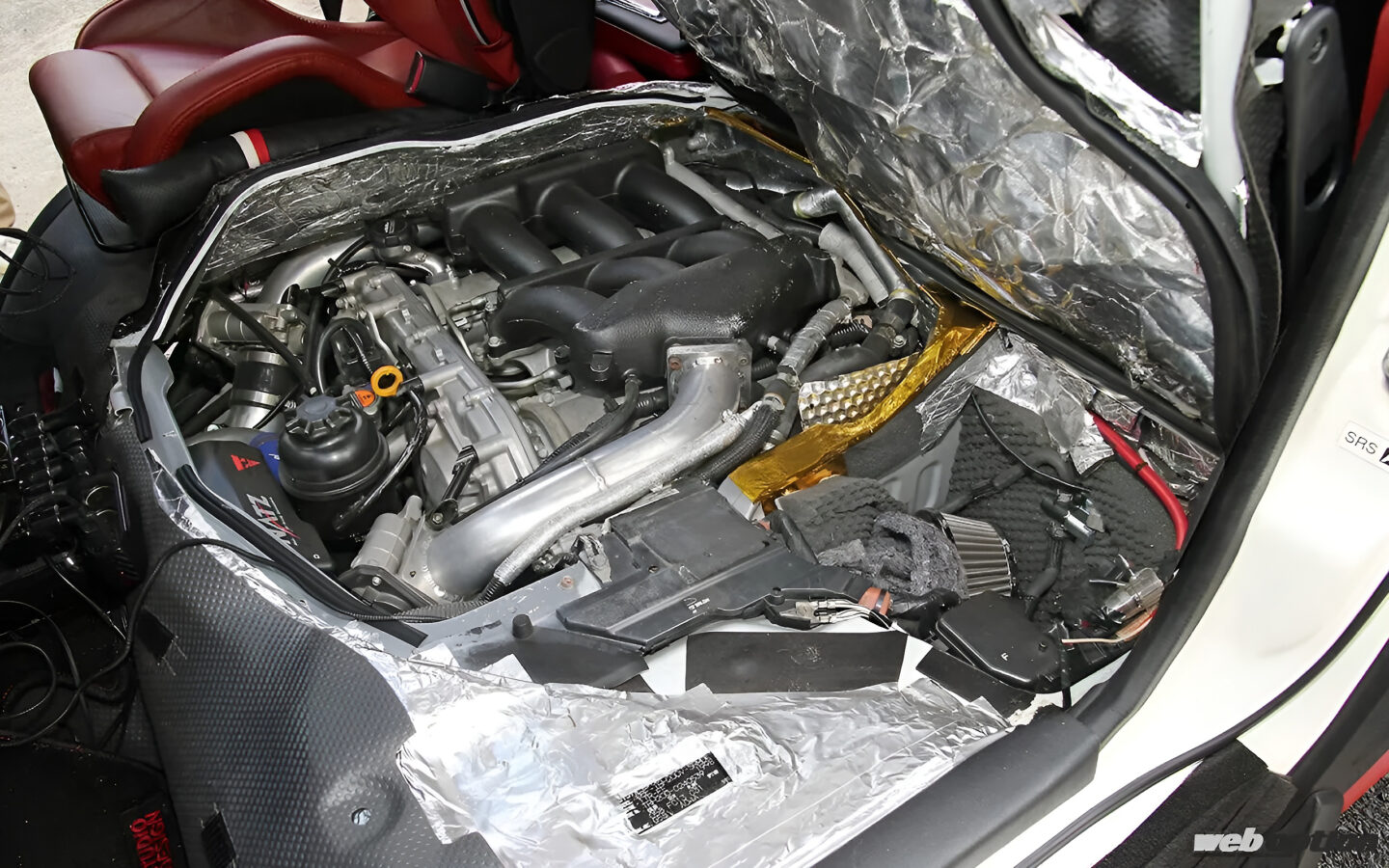 エンジンスペースを覗くと、本当にVR38DETTが押し込まれている。エンジン本体はノーマルだが、ECUチューンによるブーストアップで約600psを発揮するというから恐れ入る。