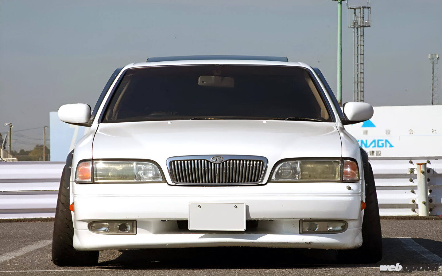 それは以前別の取材で“カザマオート”に足を運んだ時のことだった。取材車両を撮影するためファクトリー裏手に向かうと、フロントマスクがごっそり外された製作途中の大きなセダンが目に付いた。「あ、インフィニティQ45だ」。