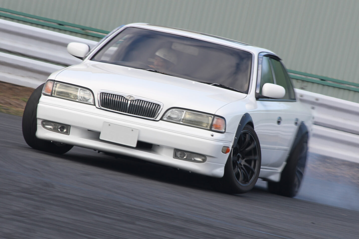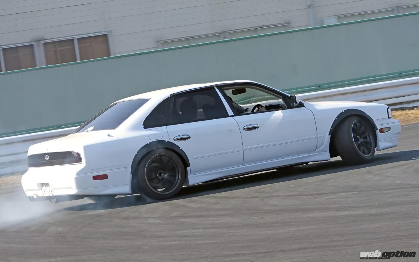 オーナー自らがステアリングを握っての初走行をコースサイドから見ていたが、全長5mを超える巨体が目の前で滑走する様は迫力満点。ECVを開放したマフラーから吐き出されるV8サウンドも盛大で、そこには、かつて日産のフラッグシップセダンだったというジェントルなイメージは微塵もない。