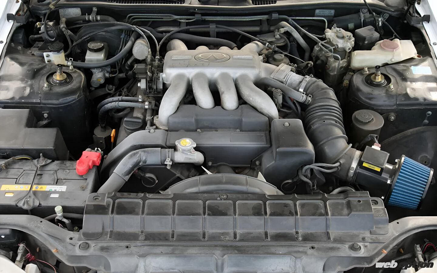 細部を見ていく。93.0φ×82.7mmでショートストローク型となるVH45DE。ほぼ時を同じくして登場したUCF10セルシオが搭載する1UZ-FEよりも排気量が500cc大きく、パワーで20ps、トルクで4.8kgm上回った。しかも、最高出力280psを6000rpmで発生。4.5Lという排気量にしては上までよく回るエンジンというのが日産らしい。