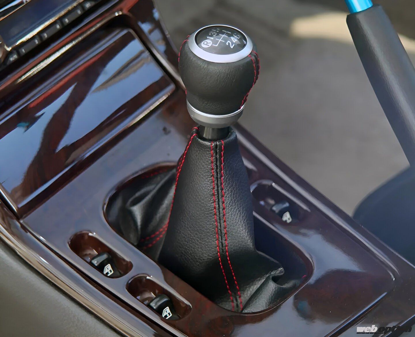 室内は、ステアリングホイールとシートが交換されている程度で、ダッシュボード周りはノーマルの雰囲気を残す。サイドブレーキはJZX100用を流用し、足踏み式からハンド式に変更される。
