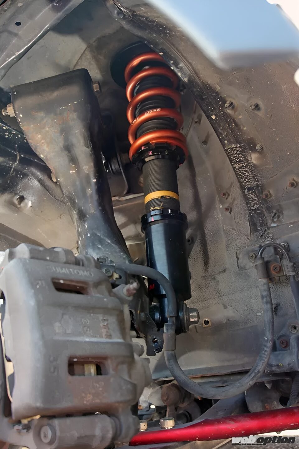 足回りは構造的にフロントがR32/33スカイライン、リヤがS14に準じたもの。車高調はDG-5の特注品で、スプリングレートはとりあえずフロント16kg/mm、リヤ14kg/mmで落ち着いた。前後のアーム&リンク類は調整式に交換され、アライメントセッティングの幅を拡げている。