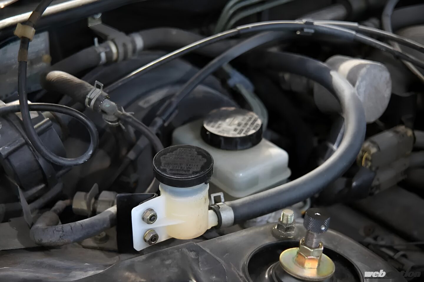 MT化に際して問題になったのがクラッチのマスターシリンダー。エンジンがバルクヘッド直前まで迫っているため、装着するスペースがなかった。そこで、ベルハウジングと併せてZ34用ダイレクトレリーズシリンダーも流用。エンジンルームにはクラッチフルードカップのみが装着される。
