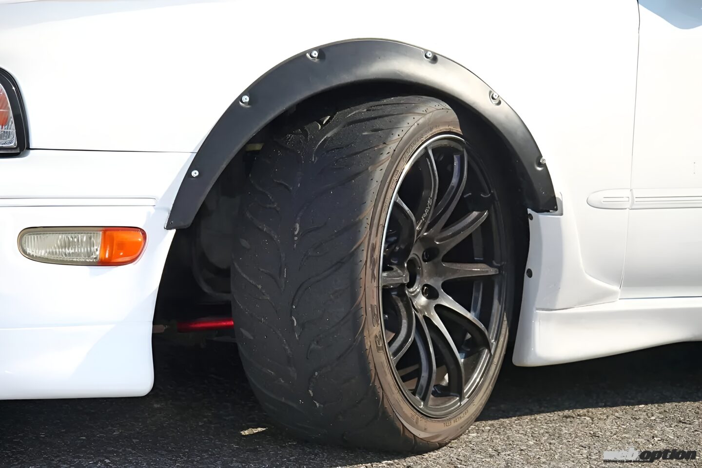 ドリフトに重要なナックルは、ショート加工を施したスカイライン用を装着し、フロントタイヤの大幅な切れ角アップを実現。タイヤは265/35R18サイズのフェデラル595RS-RRを履く。