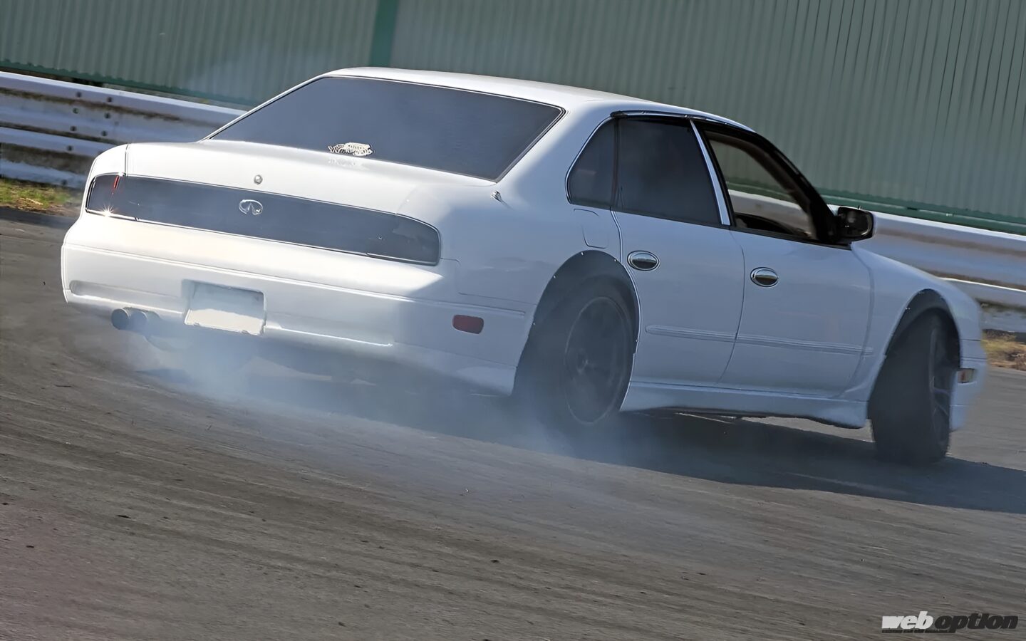 インフィニティQ45をドリフトのベース車に選ぶなど想定外すぎるが、もしこれがRB26DETTや2JZ-GTEに載せ換えられていたとしたら、あまり興味をそそられなかったかもしれない。エンジンが4.5L・V8、VH45DEのままMTに換装されているからこそ、「ぜひ取材したい!!」と思ったのだ。