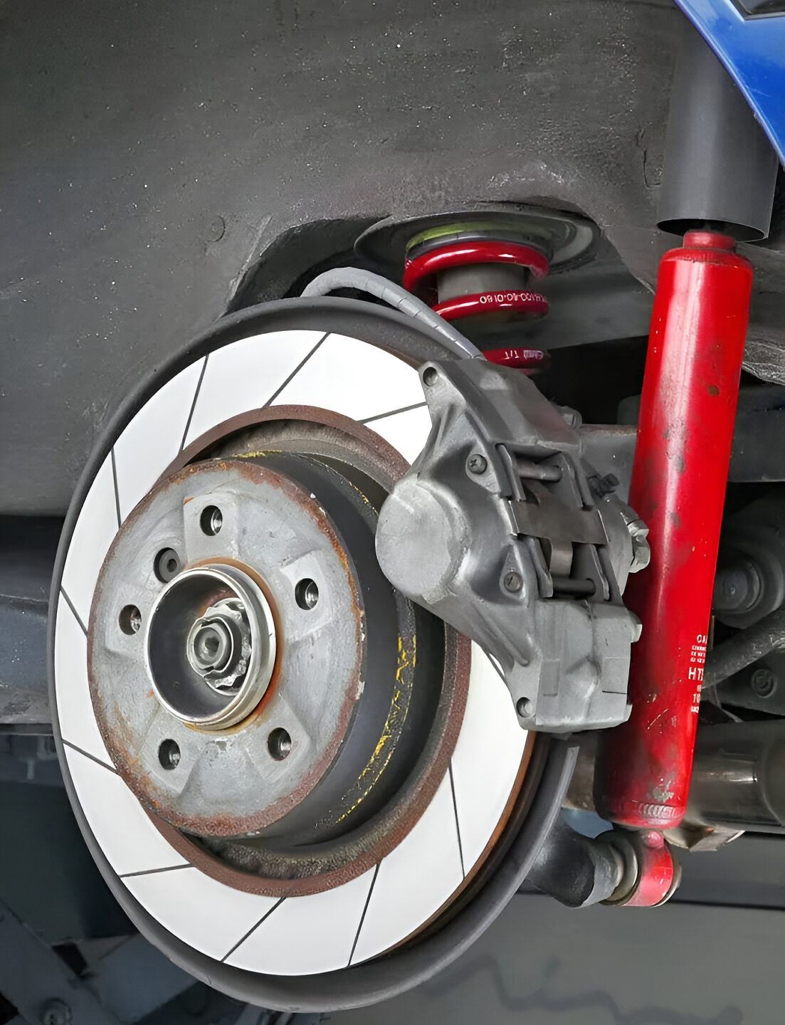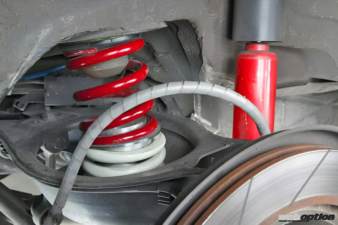 また、サスメンバーはカブリオレ用クロスブレースバーで剛性アップが図られる。ブレーキは、ブラケットを介してR32用4ポットキャリパーをセットしているのが面白い。