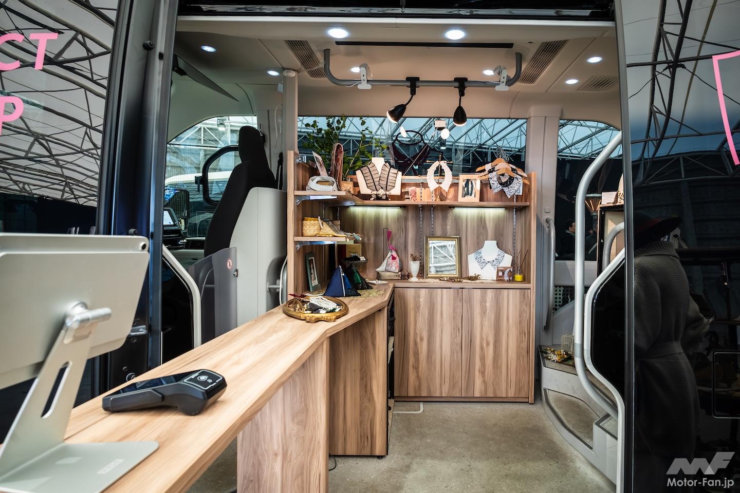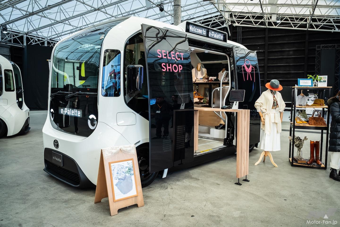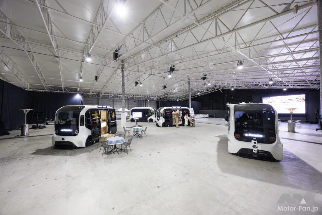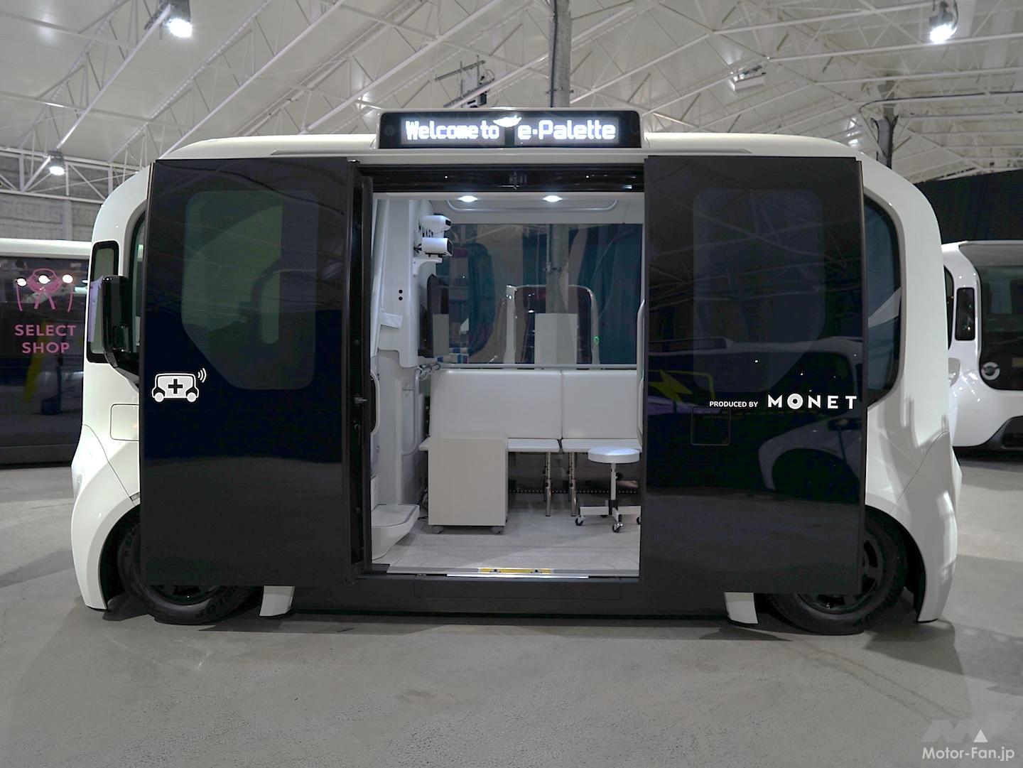 クルマであるがゆえの自走機能、BEVならではのエネルギー蓄電機能に加えて、2865×1780×2135mmという広大な車内空間、左右1280mm×上下1900mmという大開口のスライドドア、油圧による昇降機能……などを持つe-Paletteで、アイデアが広がりそうなのが、いわゆる“移動○○”と呼ばれるようなサービスだ。今回の取材会にも、移動診療車、移動パン屋さん、移動アパレルショップ……などの活用例が紹介されていたが、そうした実例を目にすると、こうしたサービスとe-Paletteとの親和性の高さにあらためて感心する。
