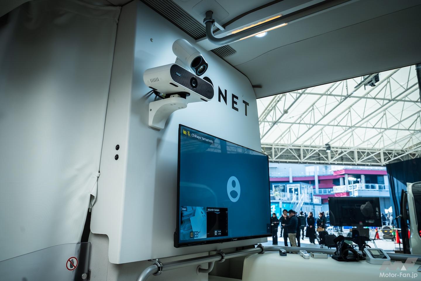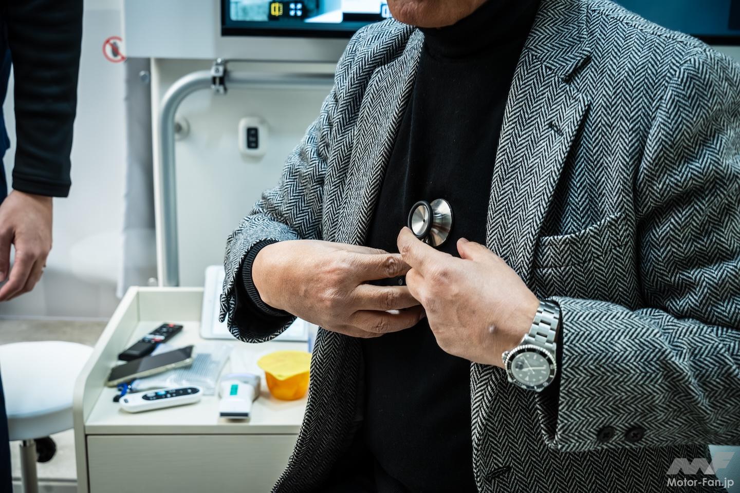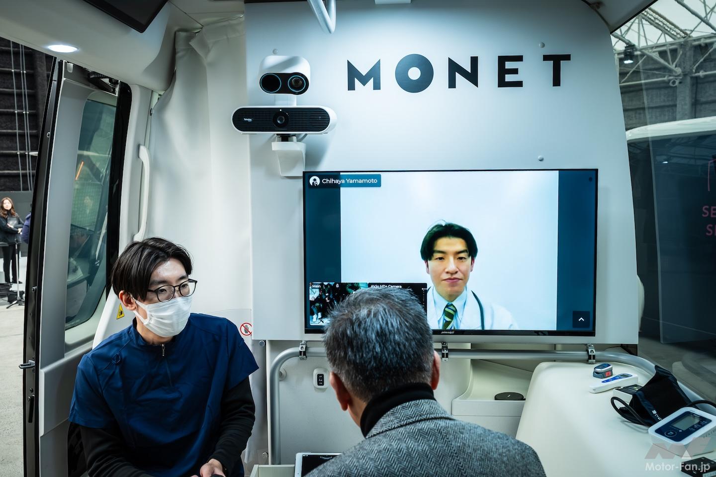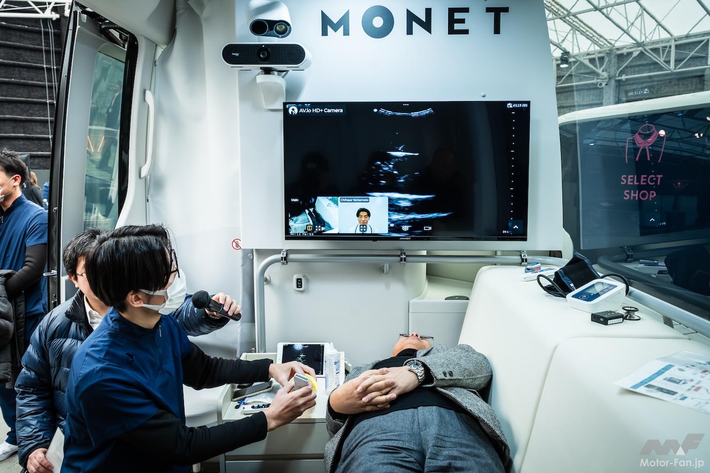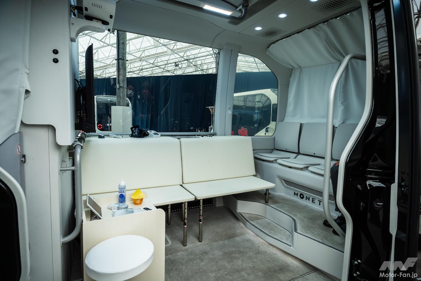 簡易ベッドを設置した移動診療車は、看護師が運転して現地におもむき、医師がリモートで診察することを想定する。聞けば、BEVは低振動なので精密な医療機器への負荷も少なく、大容量リチウムイオン電池により電力供給にも不安がないとか。なるほど。