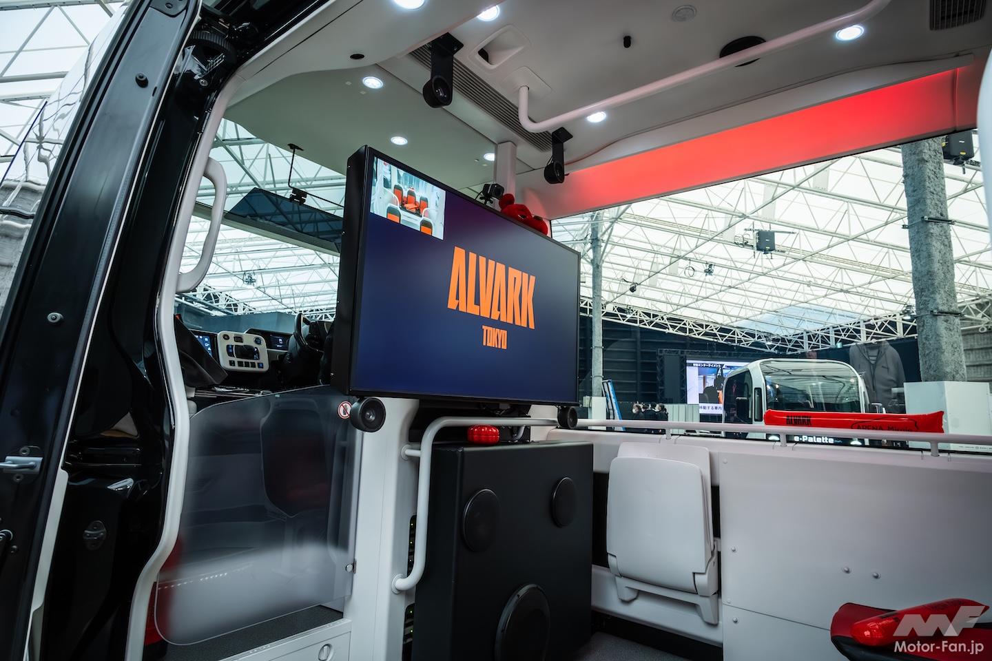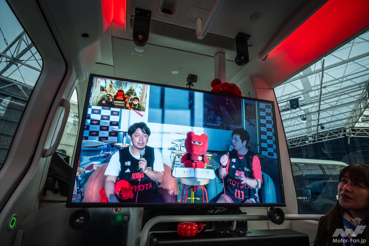トヨタがスポンサーとなっているプロバスケットチーム“アルバルク東京”のロゴが光るe-Paletteは、“推し活”サービスを想定した活用例だ。アルバルク東京では昨年、試合後に車内で選手とリモートで交流しながら東京駅まで送るサービスを実施して、大人気を得たとか。そのときに使われた車両はハイエースだったが、さらに静かで広く、コネクト性能も高いe-Paletteなら、このように50インチの大モニターや高性能サウンドシステムを搭載して、より臨場感を高められるという。