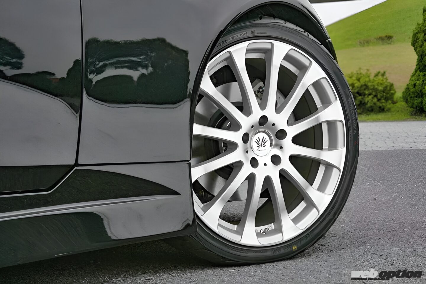 落ち着いたデザインのホイールは19インチのレアマイスター改(F8.5J R9.5J)。リムエンドまで伸びた12スポークデザインが足元に高級感を与えている。