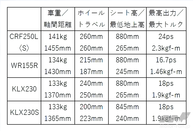 各車のスペックから推察すると、オフロードを最も速く走れそうなモデルは、ホイールトラベルと軸間距離が長く、最低地上高が高く、最高出力と最大トルクが突出しているCRF250L〈S〉だろう(車重の重さは気になるが)。