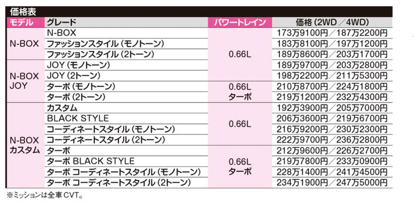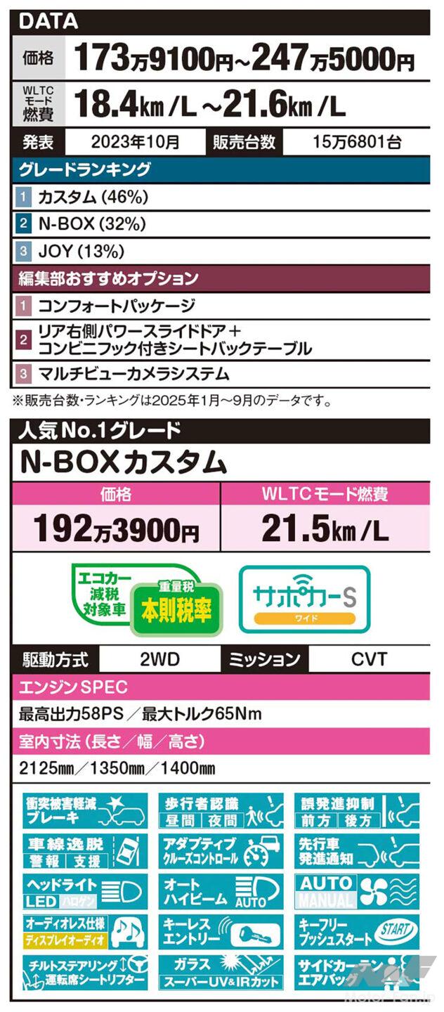 新車レビュー 「日本で1番売れてるクルマ知ってます?」ライバルを凌ぐオールマイティカー!【ホンダ・N-BOX】【写真・14枚目】 ファッションスタイル カスタム コーディネートスタイル 『LEDフォグライト&フォグライトガーニッシュ』 2025年4月の一部改良にて、「N-BOXカスタム コーディネートスタイル」には、上品なダーククロームメッキのフォグライトガーニッシュとLEDフォグライトを標準装備した。 『専用のエアロデザイン』 N-BOXカスタムでは、フロント/サイド/リアそれぞれに、ロー&ワイドなフォルムを際立たせ、空力にも配慮された専用デザインのエアロパーツが装備される。 JOY 『アクティブフェイスパッケージ』 タイプ別のディーラーオプションとしてHONDAロゴが際立つ専用のフロントグリル、バンパーまわりを引き締めるLEDフォグライトをセットにした用品パッケージをN-BOX JOY用に設定。 『チェック柄撥水ファブリック』 撥水素材のチェック柄ファブリックシートを全タイプに採用。自然吸気車はトリコットと撥水ファブリックのコンビシート、ターボ車はプライムスムースと撥水ファブリックのコンビシート素材とした。 『大容量フロアアンダーボックス』 フロア後端にある、便利なフロアアンダーボックスは、左右に浅底のポケット付き。折りたたみチェアやテーブルが入る十分なスペースを備え、フタには汚れても洗いやすい樹脂製のフロアエンドボードを採用。 『エンジン』 吸気バルブの制御に、VTECとVTCを採用した自然吸気エンジン(58PS/65Nm)。カスタムとジョイはパワフルなターボエンジン搭載車(64PS/104Nm)も選べる。WLTCモード燃費の最良は21.6㎞/L(自然吸気)、 20.3㎞/L(ターボ)。 『ミッション』 高効率な油圧制御を実現したCVTユニットを搭載。変速制御を見直して、わずかな加減速Gの変化までを抑制する。上質な走りと省燃費性能を両立した。 『Honda CONNECT』 Honda車専用の車載通信モジュール。オペレーターが対応する緊急サポートや自動地図更新サービスなど、「Honda Total Careプレミアム」が提供するサービスを利用できる。スマホでドアロック解除やスライドドア操作できる「Hondaデジタルキー」にも対応。 N-BOX N-BOXカスタム N-BOXカスタムターボ N-BOXカスタムコーディネートスタイル N-BOXジョイ N-BOXジョイターボ もうひとつのN-BOXと言えるスロープ仕様車は、車いすのままで乗り降りできる。進路補正機能付きの電動ウインチが備わり、4人乗車モードと車いす乗車モードの切り替えもわずか3アクションとするなど、使う人の気持ちに立ったフレンドリー設計がうれしい。(車両価格:191万5000円~227万4000円) ※車両価格と燃費は最低値と最高値、発表は現行車がデビューした時期、販売台数とランキングは2025年1月から9月の統計データ。グレードやオプションランキング内の%は、各メーカーに実施したアンケート調査に基づくデータです(一部編集部おすすめもあり)。衝突被害軽減ブレーキ搭載車は「サポカー」対応になるが、サポカーS対応の場合は、上記の機能がプラスされることで「サポカーSベーシック」「サポカーSベーシック+」「サポカーSワイド」とグレードアップする。 ●マークが緑色→[標準装備]/▲マークが黄色→[オプション設定あり]/◾️マークが薄い→[設定なし] この画像の記事を読む