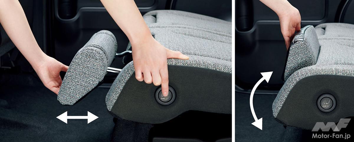 グレード名に「X」が入るモデルは、快適装備も充実。ダッシュボードのエアコン吹き出し口から出てきた冷気を後席に届ける“スリムサーキュレーター”や後席ドアガラスのロールアップ式サンシェード、寒い季節にはうれしいステアリングヒーターなどが標準装備されている。さらに後席のシートクッションには、“マルチユースフラップ”という独特の機能も装備。座面の前側に独立した部分があり、ヘッドレストのように伸縮させたり、回転させたりすることができる。これを前に伸ばせば、ふくらはぎを支える“オットマン”として使用でき、上側に回転させると、後席に載せた荷物の滑り落ち防止ストッパーとして機能させられる。
