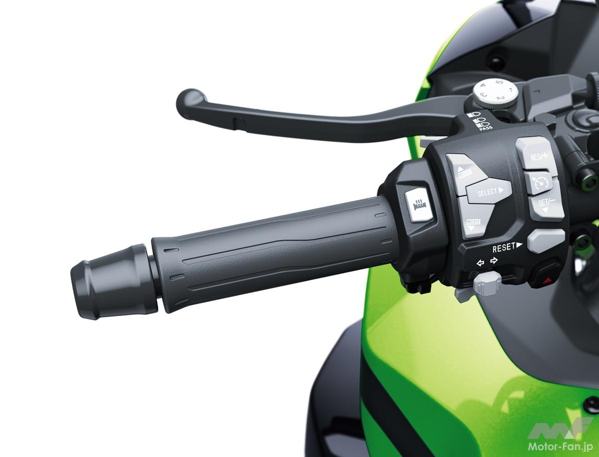 新型Ninja 1100SXは、スポーティでダイナミックなNinjaシリーズのデザインを継承しつつ、アップライトなライディングポジションを採用。これにより、長距離ツーリング時の疲労軽減と快適性を向上させている。さらに、容量19Lのフューエルタンクを装備し、長距離走行時の給油回数を減少させる設計となっている。