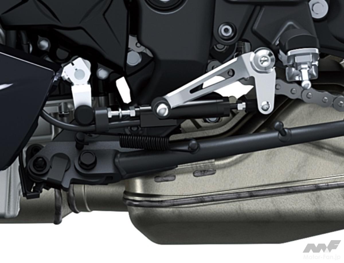 「Ninja 1100SX SE」は、標準モデルに対し、ブレンボ社製のフロントブレーキディスクとM4.32キャリパー、ステンメッシュホースを採用。これにより、制動性能とフィーリングが向上している。さらに、オーリンズ社製のフルアジャスタブルS46リアサスペンションを装備し、路面追従性と乗り心地を高めている。サイドカウルには「1100SX」の立体エンブレムが施され、特別感を演出している。