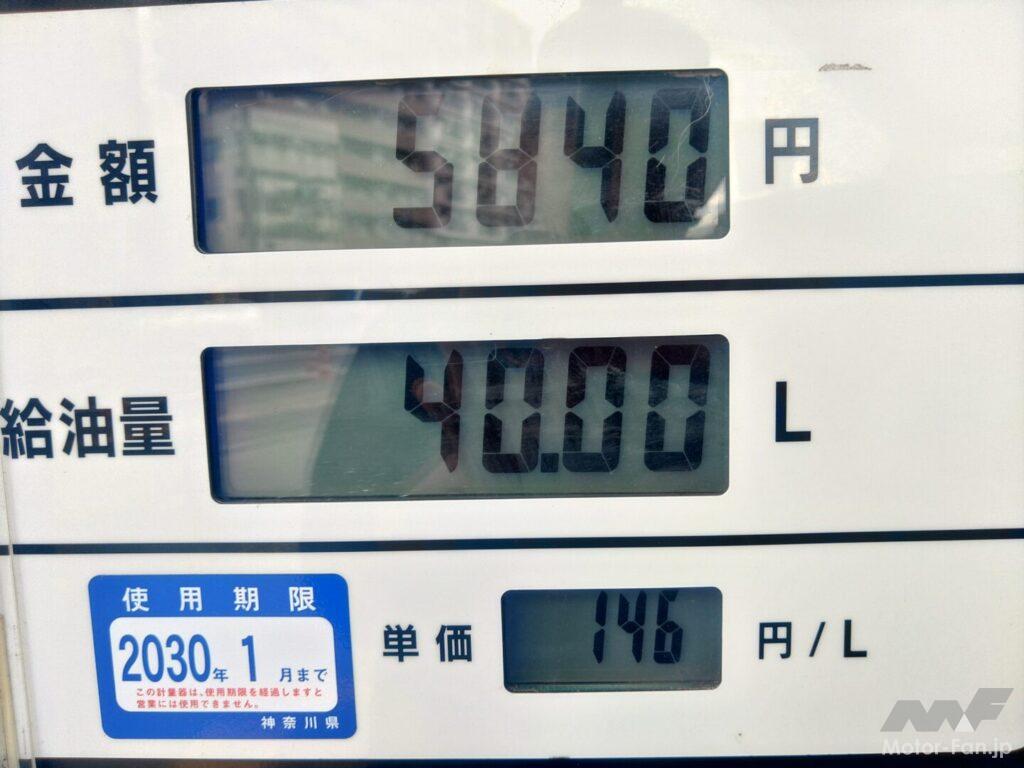 給油前の燃費計の針は半分から1目盛下を指していた。CX-80(ディーゼル)の燃料タンクは73L。燃料計の目盛が16分割で、9目盛消費ということは計算上は約41L消費していることになるので、給油量はほぼ正しいと言えるだろう。