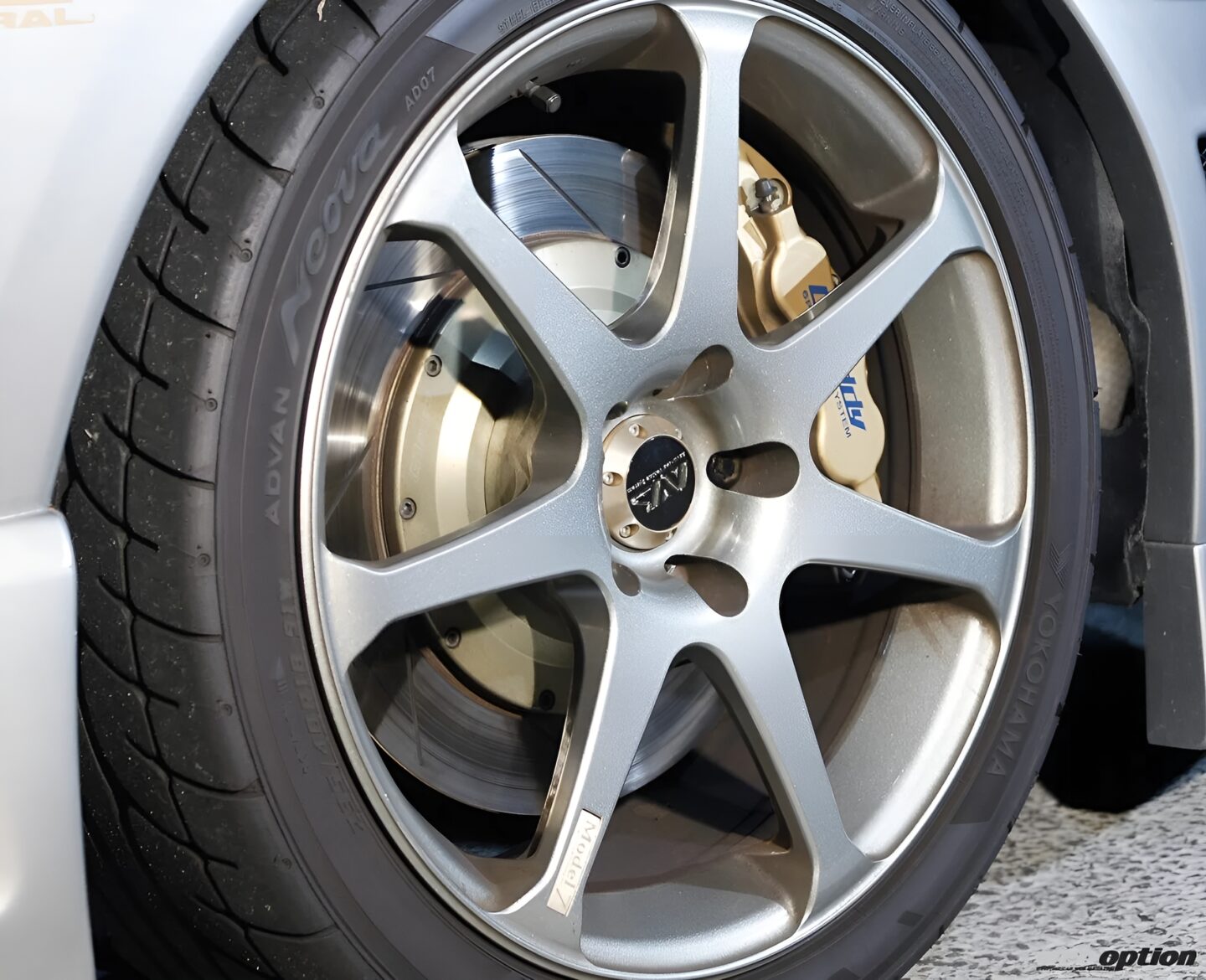 18インチのAVSモデル7に、フロント235/40、リヤ265/35サイズのアドバンネオバをセット。ブレーキはGReddy6ポット/4ポットキャリパーで、バランサーも備える。ファイナルギヤはBNR34純正の3.545に変更されている。