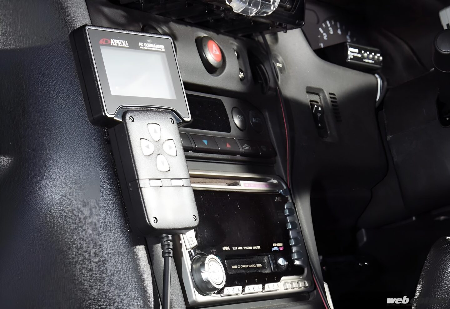 ブースト圧はステアリングコラム上のブリッツSBC-iDでコントロール。燃調や点火時期などの制御はアペックスパワーFCが担う。センターコンソールにはFCコマンダーも確認できる。ミッションは純正5速だ。
