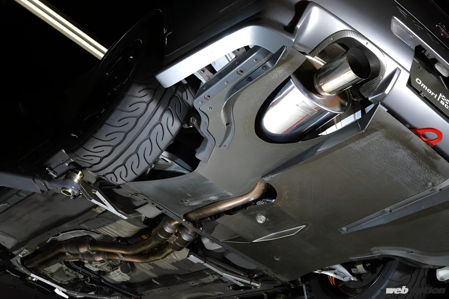 フロント下面には、擦り板(路面タッチパネル)にレーシングカーと同素材の圧縮ベニアを採用したカーボンアンダーカバーを装備。ノーマルに対してCd値マイナス5%、フロントダウンフォースは約2.2倍となる。