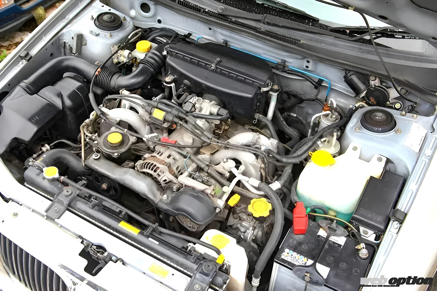 エンジンは吸気ポート形状やバルブタイミングの見直しによって性能向上が図られたボクサーフェイズII仕様のEJ15。ボアストローク比は0.774(85.0φ×65.8mm)で、EJ22やその派生となるEG33の0.773(96.9φ×75.0mm)に匹敵するショートストローク型エンジンだ。
