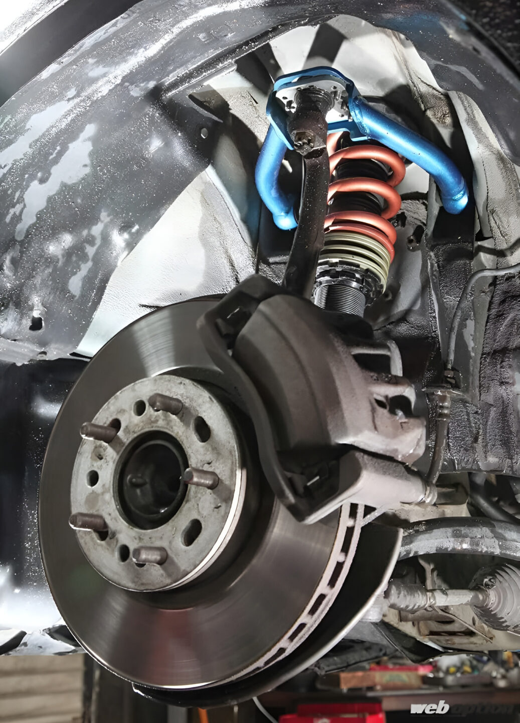 足回りはDG-5車高調、クスコ製調整式アッパーアーム、切れ角アップナックルを組み込み、テンションロッドはJZX110用にTRD製強化ブッシュを装着。