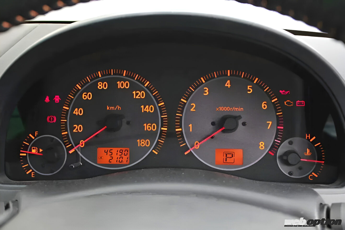 イグニッションオンで文字盤が浮かび上がるファインビジョンメーターは、右から水温計、タコメーター、スピードメーター、燃料計が並ぶ。
