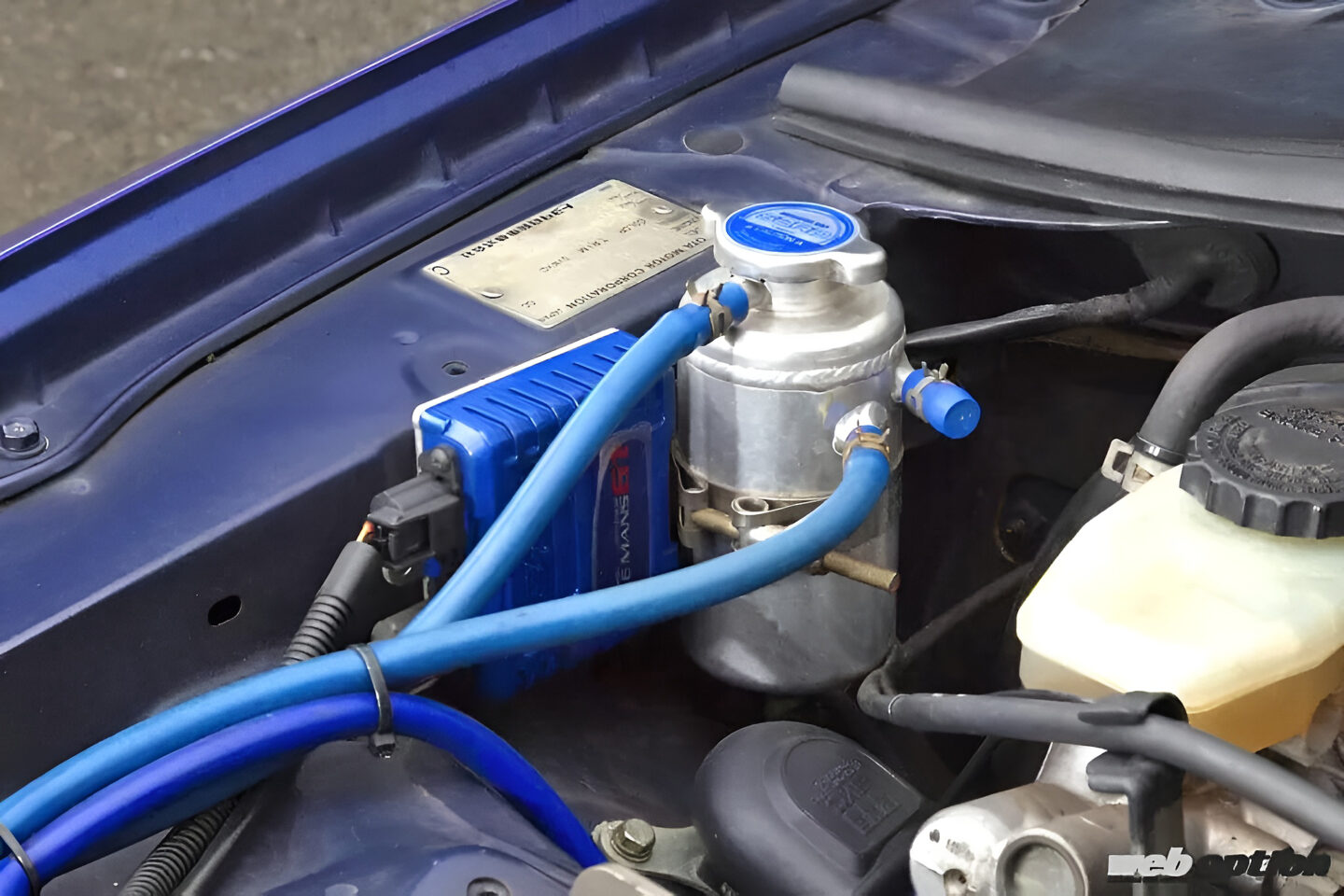 また「チューニングしたスープラで安心して街乗りするためには、冷却チューンや遮熱対策をしっかりとやっておきたいですね」とのことから、大容量アルミラジエターを始め、カーボン製ラジエターパネル、冷却経路内のエアを分離するブリーザータンクなど、クーリングパートの強化を徹底。運転席側のフロントタイヤ前方には、オイルクーラーも装着されている。