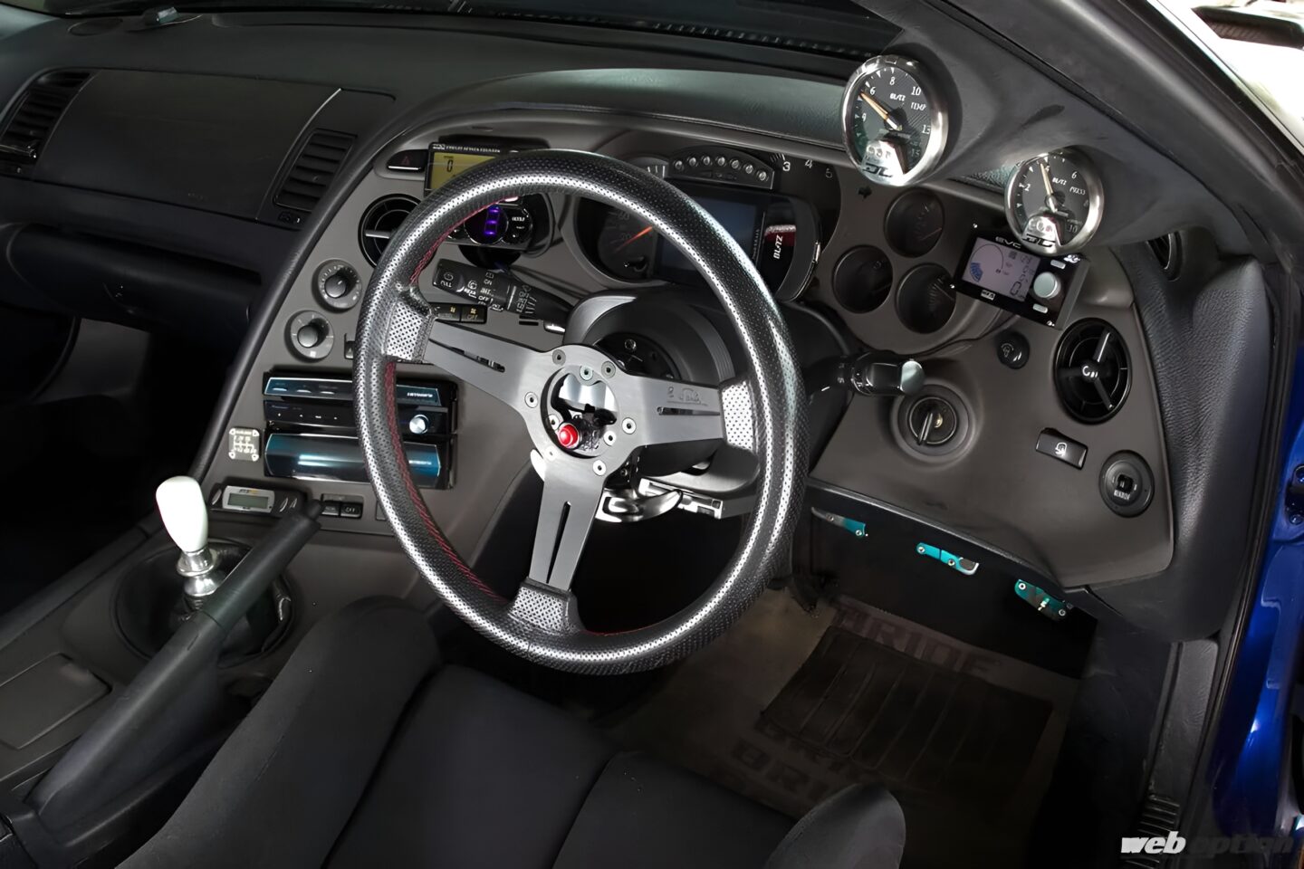 室内はリヤに5点式ロールケージこそ投入されているものの、追加メーター類はAピラーやインパネに取り付けてスマートさを演出。運転席はブリッドのジータIII、助手席はセミバケのボルガをチョイスする。