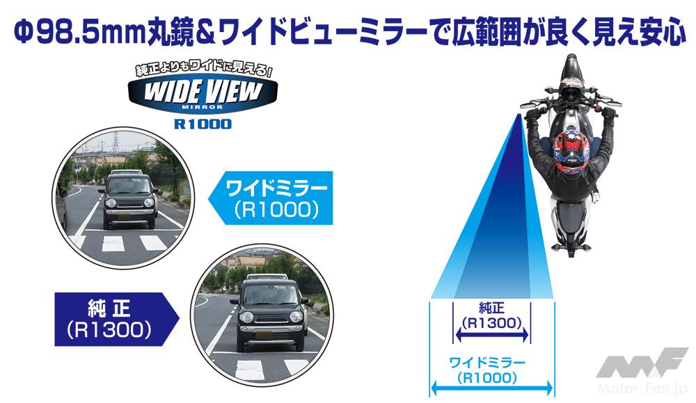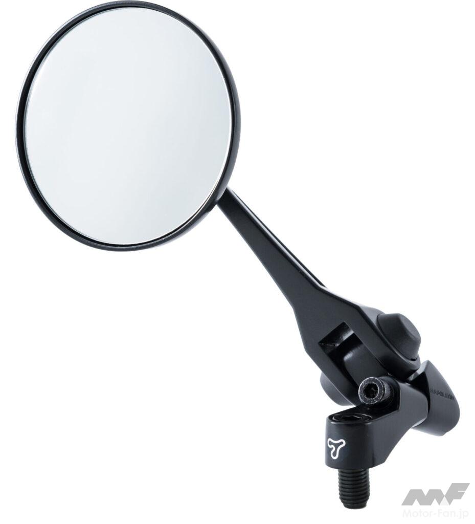 中央が肉抜きされた独特な形状のステー部分はそのままに、φ98.5mmの丸型ミラーをセット。ミラーのサイズはコンパクトながら鏡曲率半径はR=1000mmとなっており、幅広い範囲を見渡すことができるWIDE VIEW MIRRORを採用。歪みの少ない高品質の鏡を使用し、カット面のギラツキ防止処理を行なって見え方と質感にこだわっている。ミラーのハウジングもアルミダイキャスト製なので、金属の硬質な質感がいい。