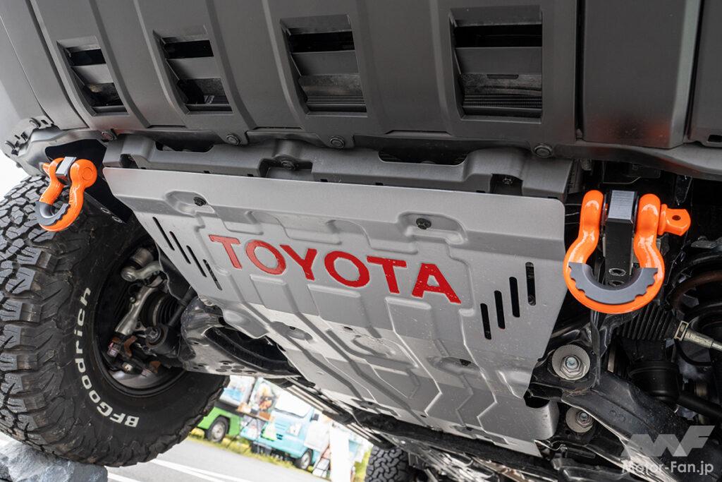 ヘッドライトや左右のウインカー、グレードバッジ、給油キャップ、ステッカーなどなど徹底的にUS純正パーツを取り入れ、同じランクル250乗りでも気付かないほど徹底的にUSDM化。アンダーガードもUS仕様はかなり長い!