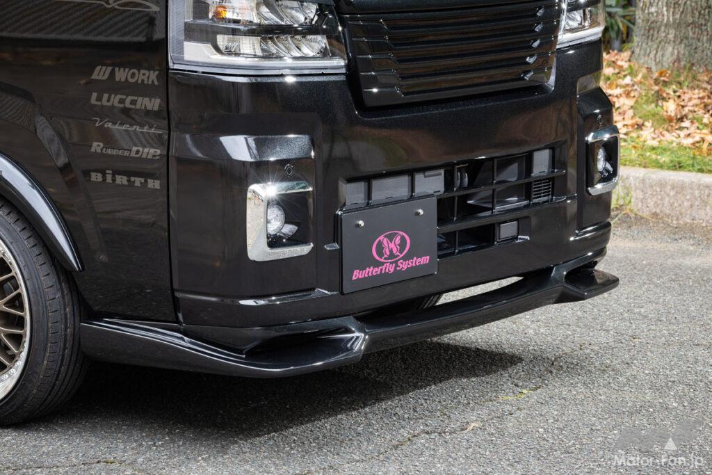 軽トラは純正サスのストロークが極端に短いため、ローダウンをすると快適性が失われる。しかも、最低地上高も低くなるため、使い勝手も悪くなる。しかし、バタフライシステムによる独自の市場調査の結果、軽トラには実用性を求めるユーザーが多いということが判明。そこで辿り着いた答えがここにあるのだ。しかも、フロントはテープのみ。リアは純正のボルト穴を流用した4本のボルトのみで装着可能という、誰でも手軽にドレスアップを楽しめる「グランツフラップ」シリーズのコンセプトも継承している。