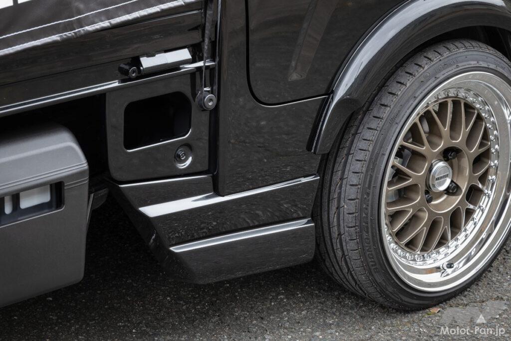 ハイゼット用と同様アーチダウンオーバーフェンダー(前:出幅30mm/アーチダウン40mm、後:出幅45mm/アーチダウン60mm)が目玉。ホイールは、ワーク・マイスターS1(2ピース:前後15インチ×6.5J/オフセット前+30、後+20)を装着している。