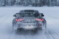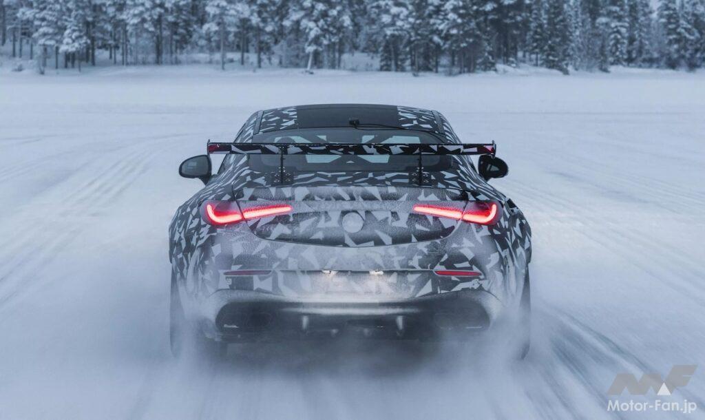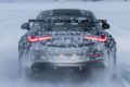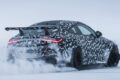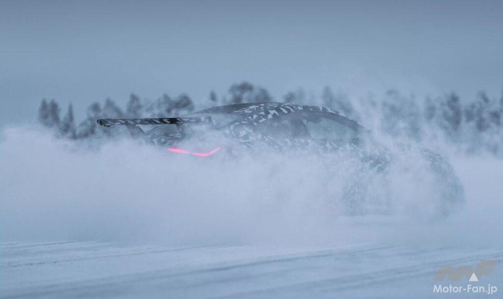 リアウィンドウから見えるのは後部座席用のロールケージだが、これはテストドライバーが車両のハンドリング限界を探る際に安全を確保するために装着されただけだろう。凍った湖と思われる場所でオーバーステアを起こしている車の写真では、後輪だけで雪が舞い上がっている様子が映っており、二輪駆動のパワートレインを示唆している。