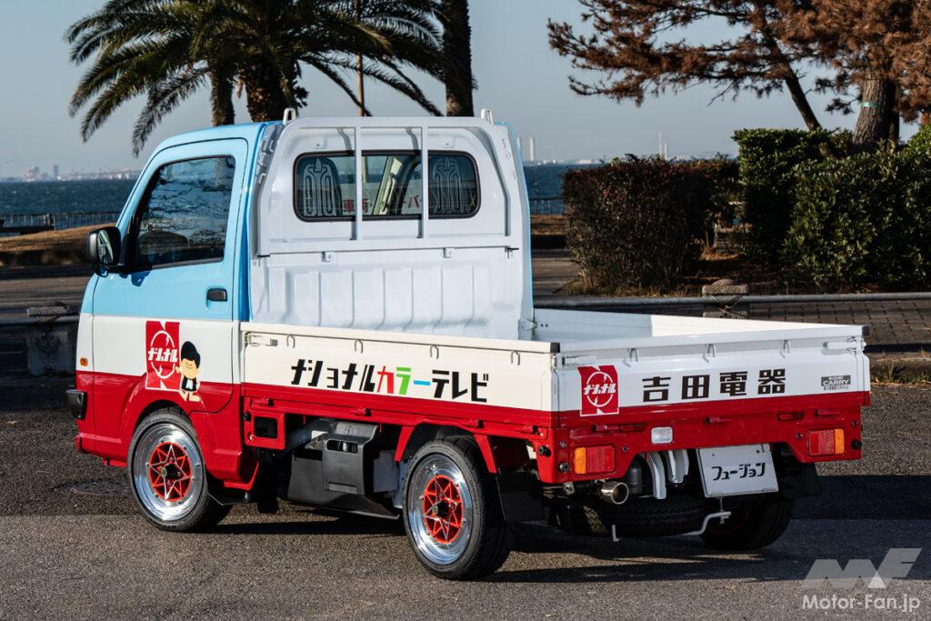 そしてキャリイにはローダウンした旧車カスタムとの親和性が高い、フェイスリフトキットを提案。こちらは幅広い世代に人気のサニートラックをイメージした意匠で、フロントパネルやヘッドライトなどフロントまわりをごっそり入れ替える仕様だから大きな変化が楽しめる。デモカーのようにコマーシャルカーのようなカラーでペイントしたら、目立ち度がさらに向上。フュージョンはアゲからサゲまで、どんなスタイルも全力でバックアップしてくれる。