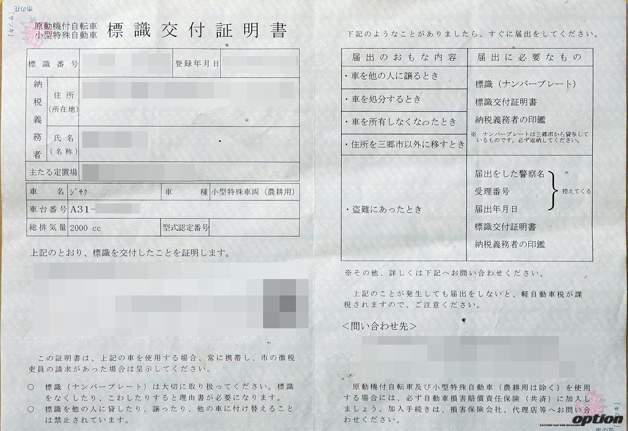 各市町村によって交付される『標識交付証明書』が、普通自動車でいう車検証のようなもの。車体番号を見るとA31の文字があり、車名は“ジサク(自作)”、車種は“小型特殊車両(農耕用)”となっていた。自賠責保険に加入する必要もないそうだ。