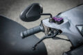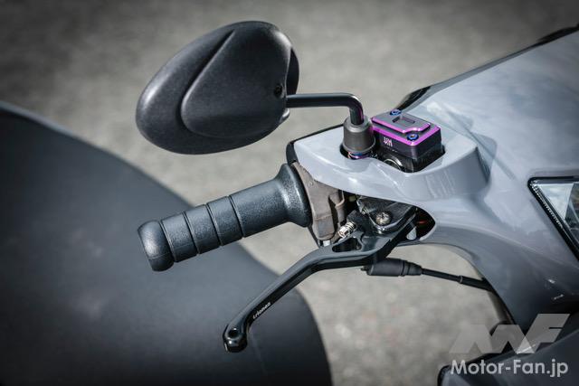 グリップはdomino製とし、質感が素晴らしいTriones製のアルミ削り出し調整式レバーを左右に配置。ミラーは車幅を考慮した台湾製の小型なものとしている。マスターシリンダーカバーはKN企画製のアルミ削り出しとなっている。