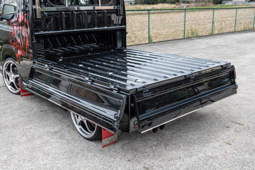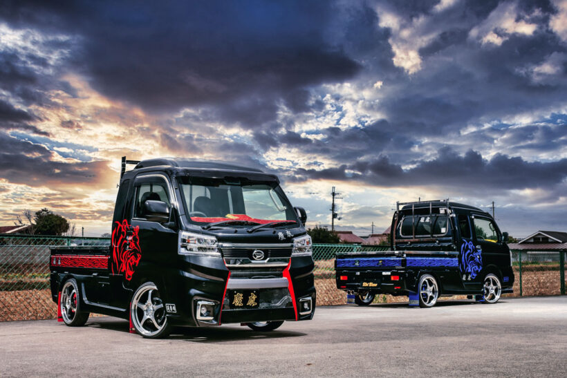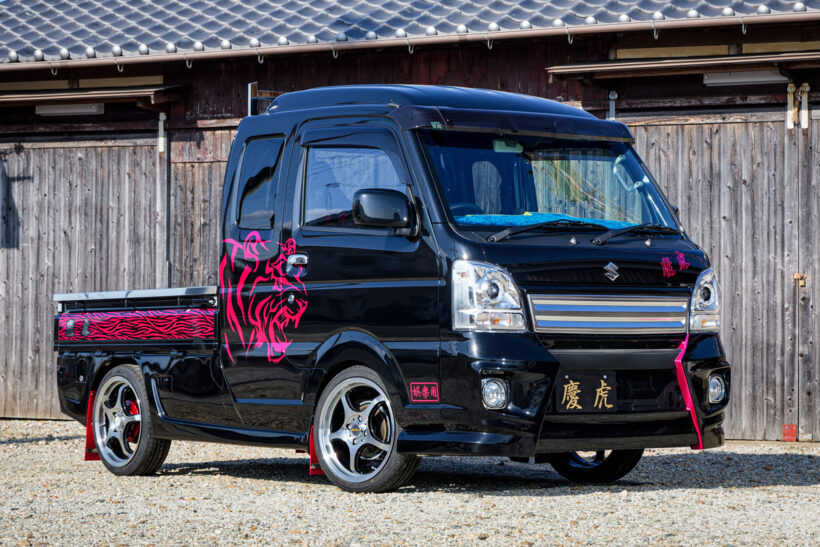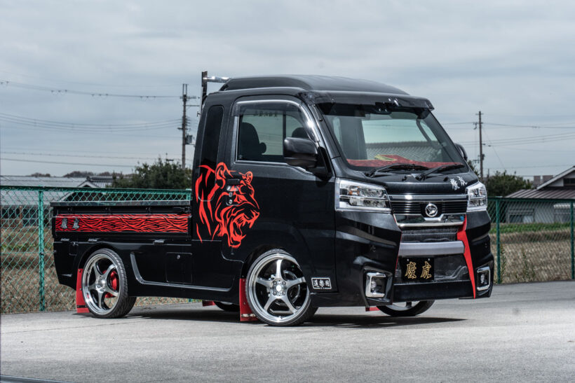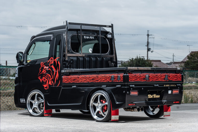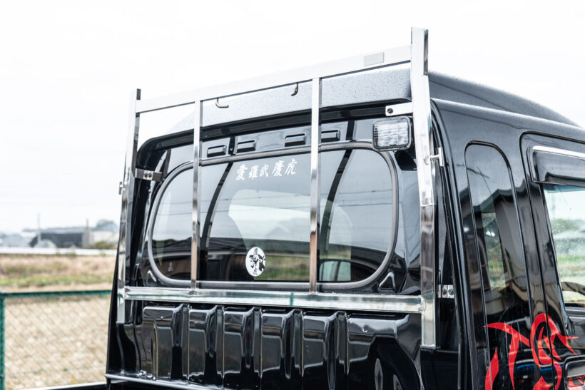 アイテム(カスタム) 「軽トラがシャコタン!? エアロ付き!?」職人さんも歓喜する選択肢豊富な慶虎のボディキット【写真・19枚目】 サイドパネルも装着しているが、荷台のアオリを開けても干渉しない設計。荷物の積み下ろしが多い人には、これは非常にうれしい特長だ。給油口とバッテリー部分には鍵付きのカバーを用意。いたずらや盗難など、「もしもの時」の防止に一役買ってくれる。 給油口とバッテリー部分には鍵付きのカバーを用意。いたずらや盗難など、「もしもの時」の防止に一役買ってくれる。 ステアリング鏡面仕上げのアングルポスト(鳥居)は、スーパーキャリイ用も設定。キラキラとした輝きは後ろから見るととっても目立つ‼ ブランドロゴの“慶虎”が背もたれ部分に大きく刺繍されたシートカバー。ダイヤステッチも施し、こちらも内装の変貌感は抜群。 フロアマットはウェーブブラックの他、レッド・ブルー・グレー・ホワイトのチェック柄が用意されている。しかもロゴプレート付き。 ストロークの少ない軽トラの特性を踏まえて設計されたサスペンション。低車高と乗り心地を両立する。もちろんリア用リーフもセット。 金華山チンチラ生地でフリル付きのダッシュマットはキャリイ系にもラインアップ。カラーは3タイプあり(ハイゼット系も同様)。 慶虎・S500SP HIJET JUMBO 慶虎・S500SP HIJET JUMBO フロントガラス上部に取り付けてまぶしい日差しを遮ってくれる“HISASHI”。カラーはスモークとメッキの2色をラインアップ。 長尺物を積載する際に役立つだけでなく、意外な注目度にドレスアップ効果も期待できるアングルポスト(鳥居)。色はステンレス鏡面。 伸びやかなスポークが特長のホイールは慶車輪。14インチ、15インチ、16インチの3サイズを設定している。赤い部分はドラムカバー。 テールランプもケイゾーンのオリジナル。コの字型のファイバーLEDと粒々LEDを組み合わせて純正とはかけ離れた見た目を実現する。 ダッシュマットはトラッカー御用達の金華山チンチラ生地で作成。好きな人にはたまらない、まさに「刺さる」デザインと言える。 ブラックを基調とし、レッドのステッチと同じくレッドのロゴ刺繍を入れたシートカバー。背もたれと座面のダイヤキルトもとってもオシャレ。 慶虎・D16T SUPER CARRY この画像の記事を読む