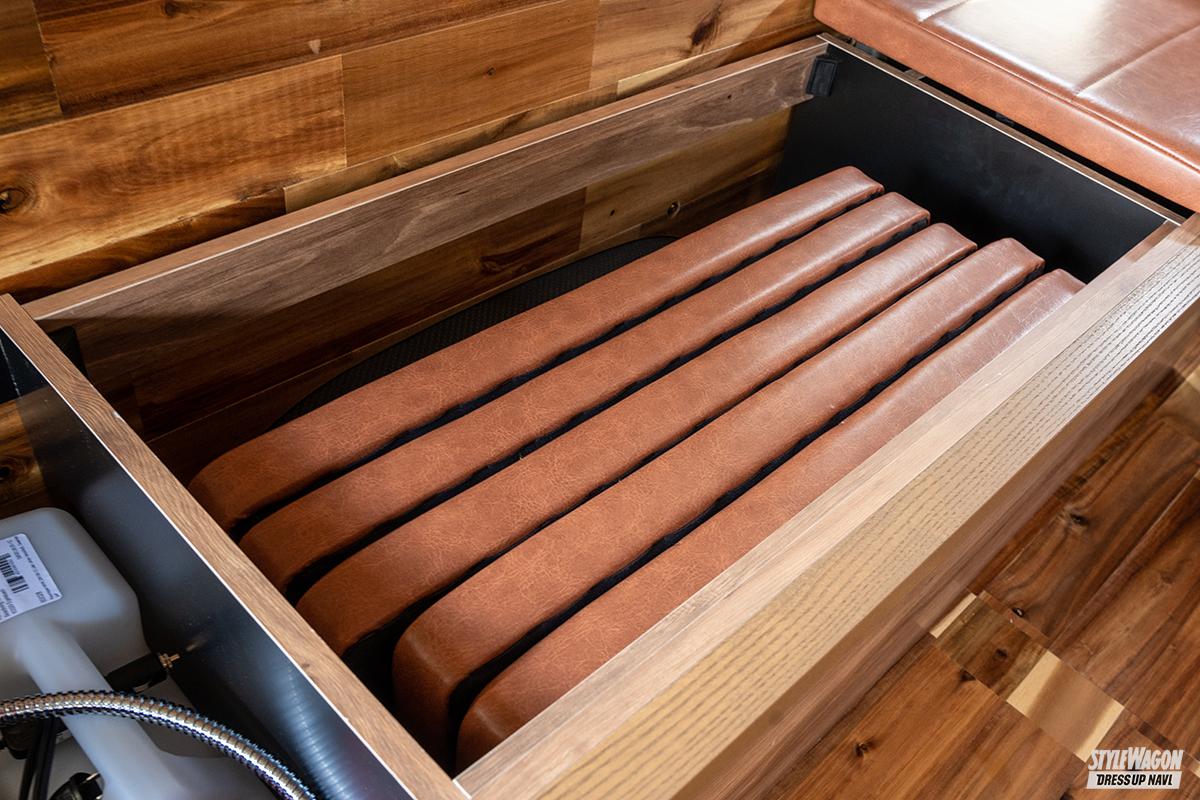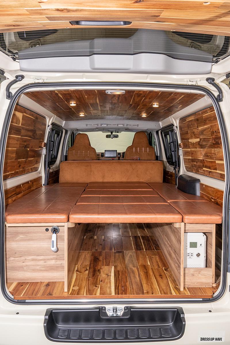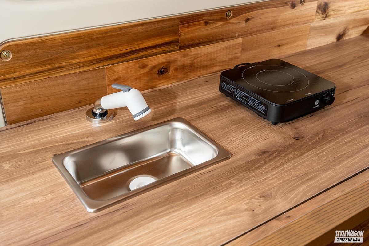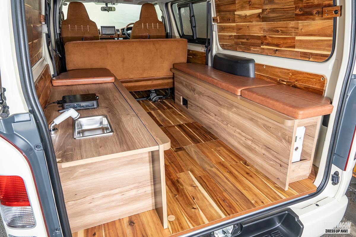 リアルウッドによる内装のコンプリートは2種類あり、ひとつは車中泊向けのバントリーデラックス。様々なアレンジが可能なベッドキットは、テーブルになったり、外でも使えたりと使い勝手抜群だ。そしてもうひとつが、キャンピングカーとして8ナンバー登録をするベンリー。シンクとIHコンロの簡易キッチンを備えているので、簡単な食事を車内で完結できるライトキャンパー仕様だ。