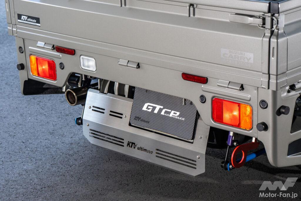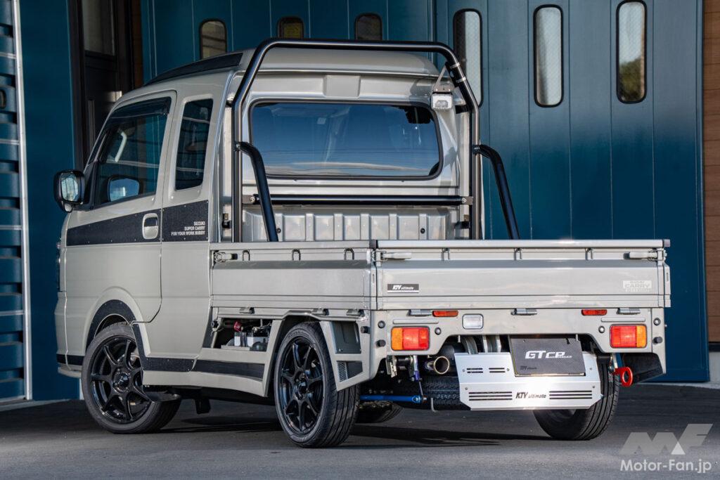 軽トラの走行会も主催するGTカープロデュース。だからこそ、当初から続くロングセラーのアイテムは「走り」に特化したものが揃っている。例えばスタビライザーやロールバー、足まわりなどがそうだ。もちろんエアロパーツもカッコよく、それでいて走行性能を損なわないボリューム感が特長(なお、スーパーキャリイで装着しているエアロは現在販売停止中。再販の予定あり)。デモカーのDA16Tスーパーキャリイもそんなテイストで仕上げられている。そのために、軽トラでありながら疾走感に溢れたフォルムを持ち、走り出せばキビキビとしたドライブフィーリングで操る楽しさを味わえる、まさに「運転したくなる」ようなクルマとなっている。