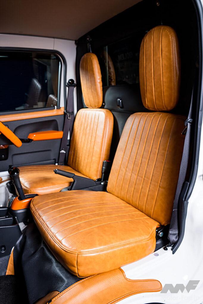 PVCレザーを採用した車種専用のレザーシートカバー。キャメルのクラシックレザーのほか、レッド、ホワイトのキルティングレザーも。
