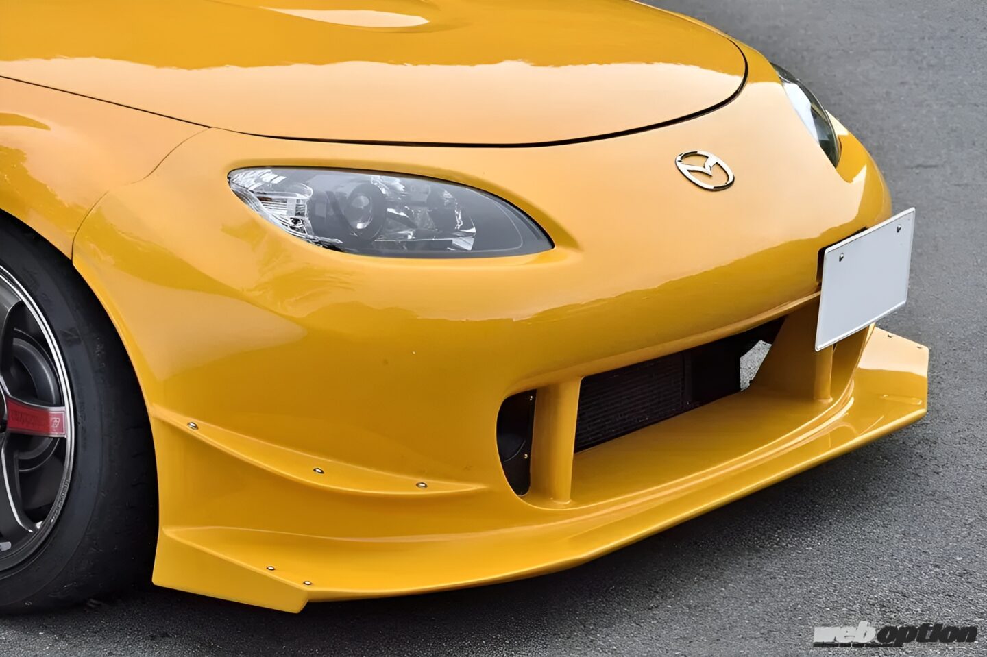エアロパーツはオリジナルで統一。アグレッシブなフロントバンパー(GTスペックTA)は、同社が展開するスーパー耐久シリーズ認定エアロをベースにしたタイムアタック向けのハイダウンフォース仕様。大きく張り出したアンダースウィープが高性能を物語る。