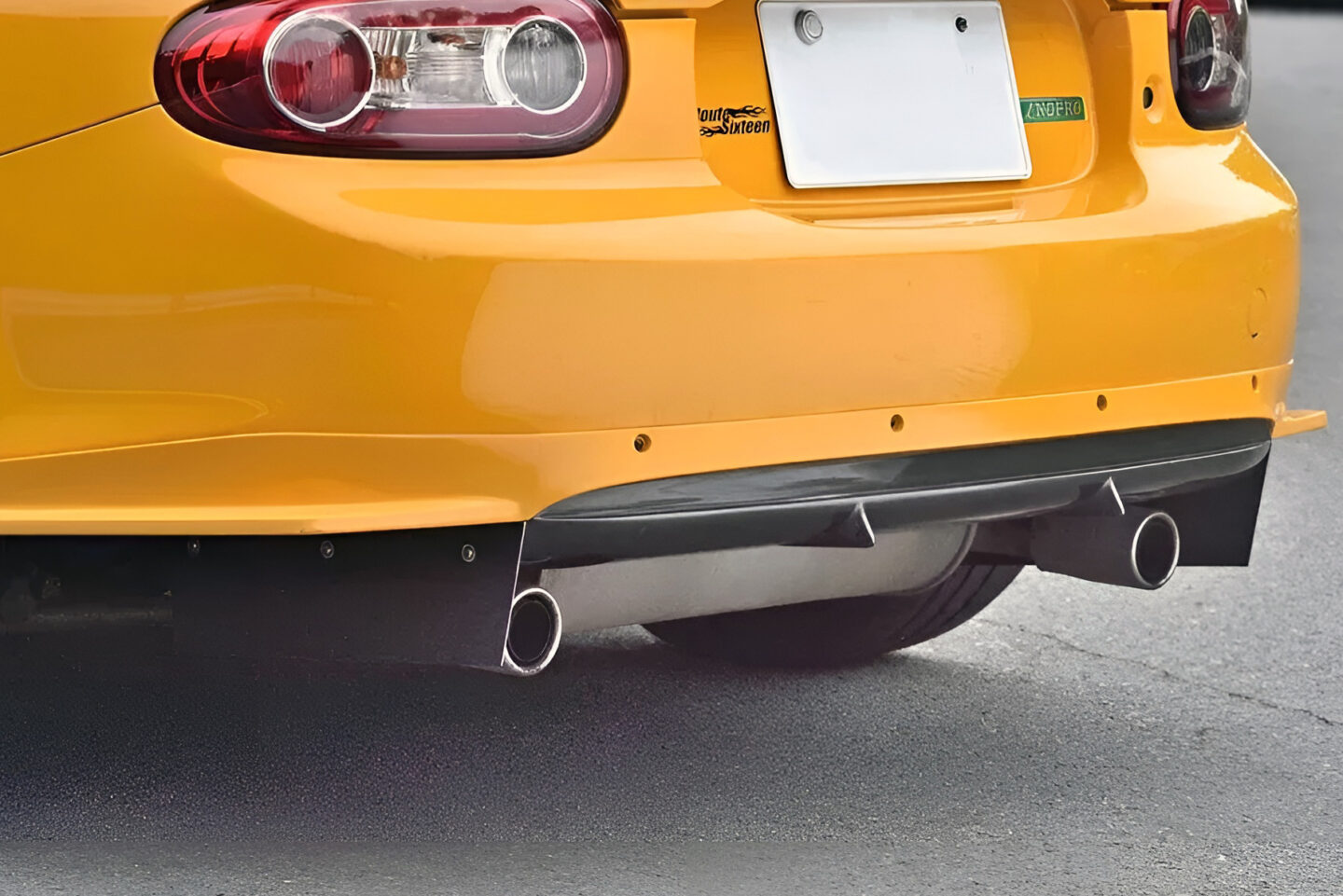 純正リヤバンパーの下部をカットして装着するアンダースポイラーは同社の隠れたヒット作。左右のバーティカルフィンは脱着可能だ。エキゾーストマフラーは純正品だが、センターパイプのみ交換されている。