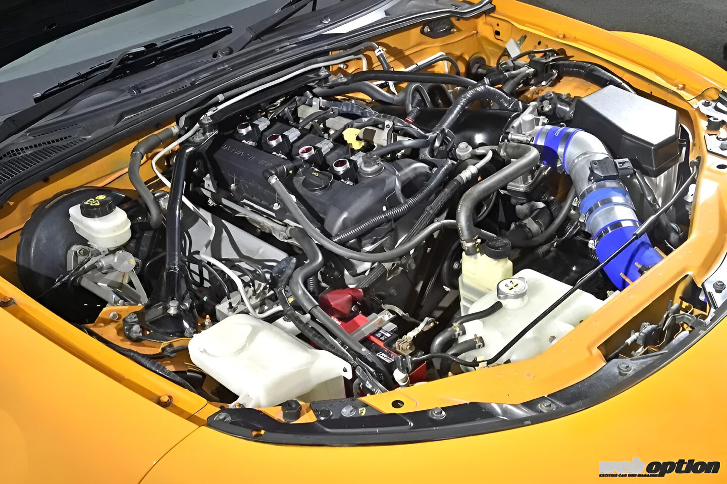 チューンドは高回転域での失火が命取りになる。そこでイグニッションコイルには、ハイスパークイグニッションコイルのプレミアムタイプを導入。長時間&持続的な高エネルギースパークにより、エンジン性能を最大限に引き出すことが可能だ。遮熱板の隙間から覗くEXマニは、オリジナルの4-1完全等長モデルとなる。